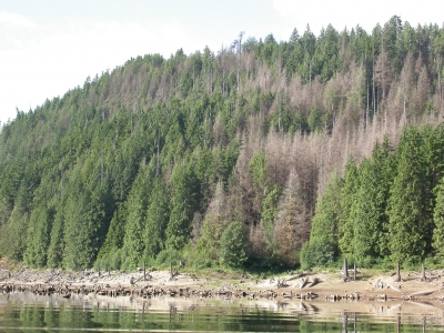 In a second study of disturbance effects, I analyzed the temporal pattern of tree death and the resulting rates of mortality after the 2000-2003 western hemlock looper outbreak. I hypothesized that mortality of trees in defoliated areas would be influenced by tree diameter, with smaller trees more susceptible to defoliation and dying at a greater rate than larger trees. Using repeated census data, I was able to show species-specific responses in mortality following western hemlock looper outbreaks. Western hemlock had high levels of mortality across all diameter classes, while mortality of western redcedar and amabilis fir was confined to smaller trees.